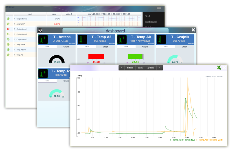 Użytkownik łącząc się z jednostką centralną ma możliwość monitorowania działania systemu - sprawdzenia wyników pomiarów w postaci wyresów, tabelarycznej.